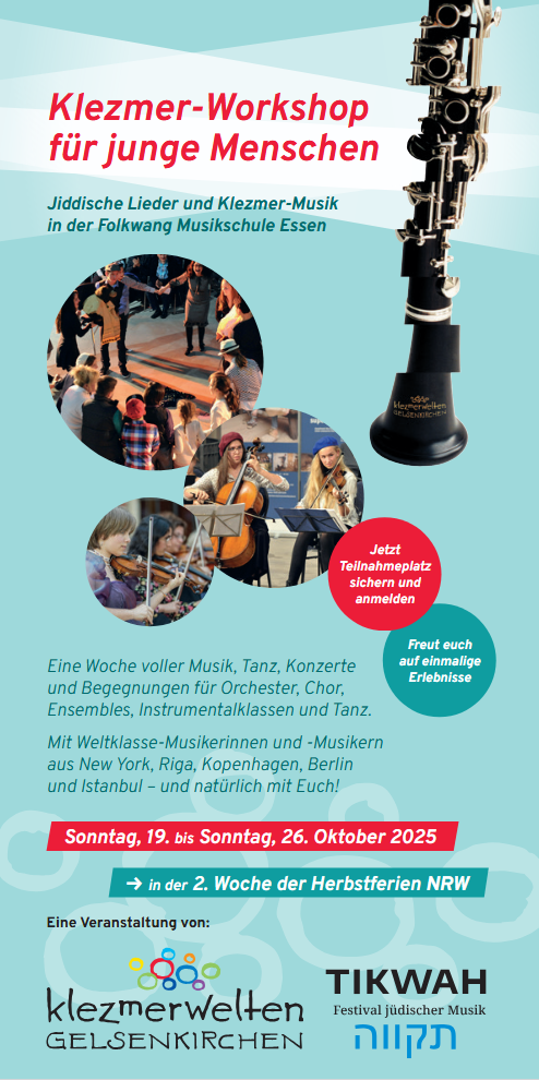 Im Oktober 2025 bietet der Klezmer-Workshop für junge Menschen in der Musikschule in Essen eine absolut einmalige Gelegenheit mit einigen der besten Musiker*innen der Welt jiddische, türkische und griechische Musik zu erleben, zu erlernen und gemeinsam auf die Bühne zu bringen.
